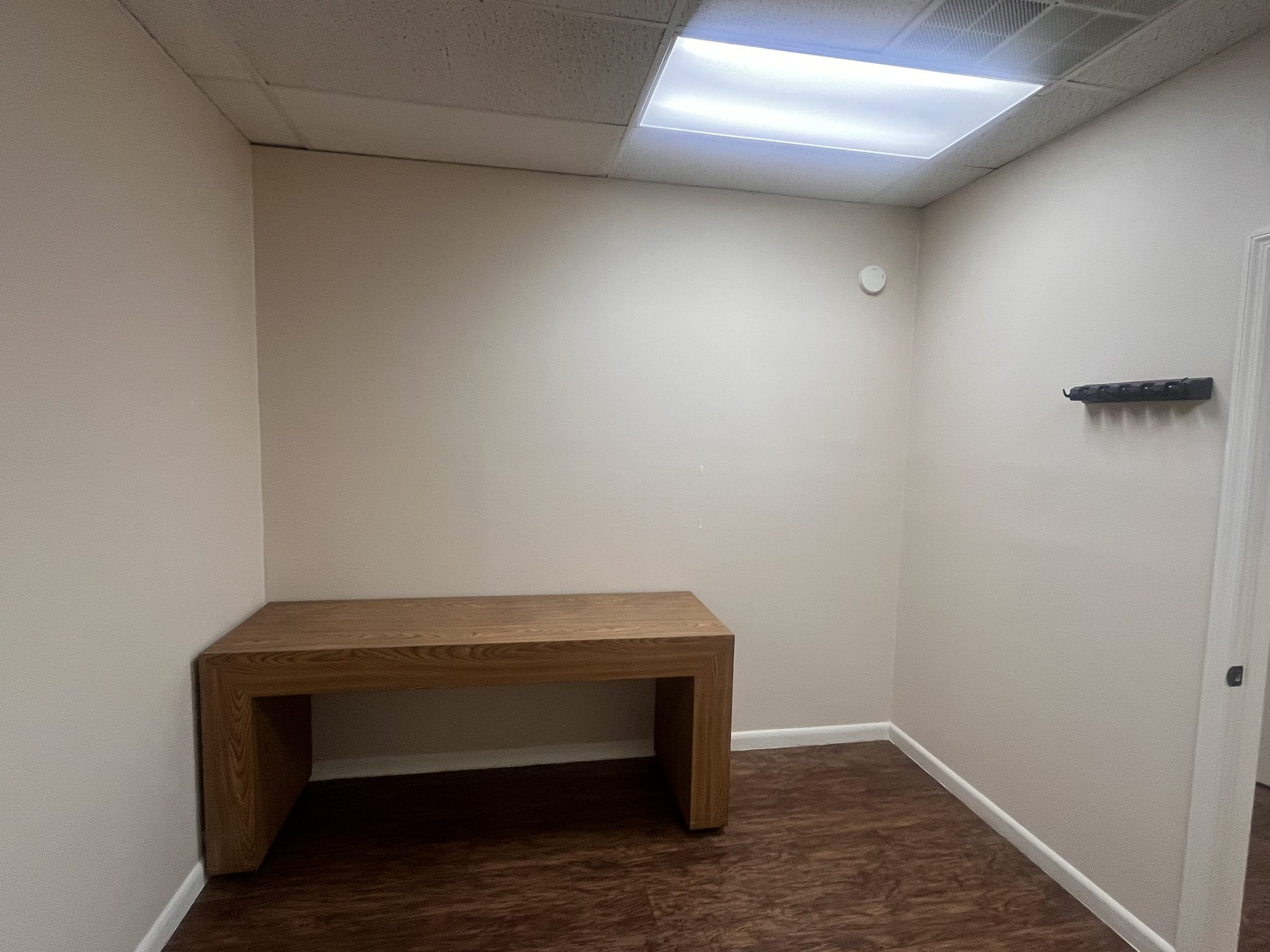 This modern buildout features a welcoming lobby and reception area with a built-in pass-through window, ideal for client or patient check-in. The suite includes four private offices or non-plumbed exam rooms, with plumbing available at an additional cost for medical or specialty use. A dedicated break room/lab area offers cabinetry and a sink, along with built-in desk areas and additional sinks for exam room support.